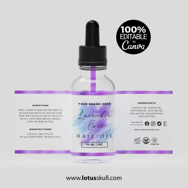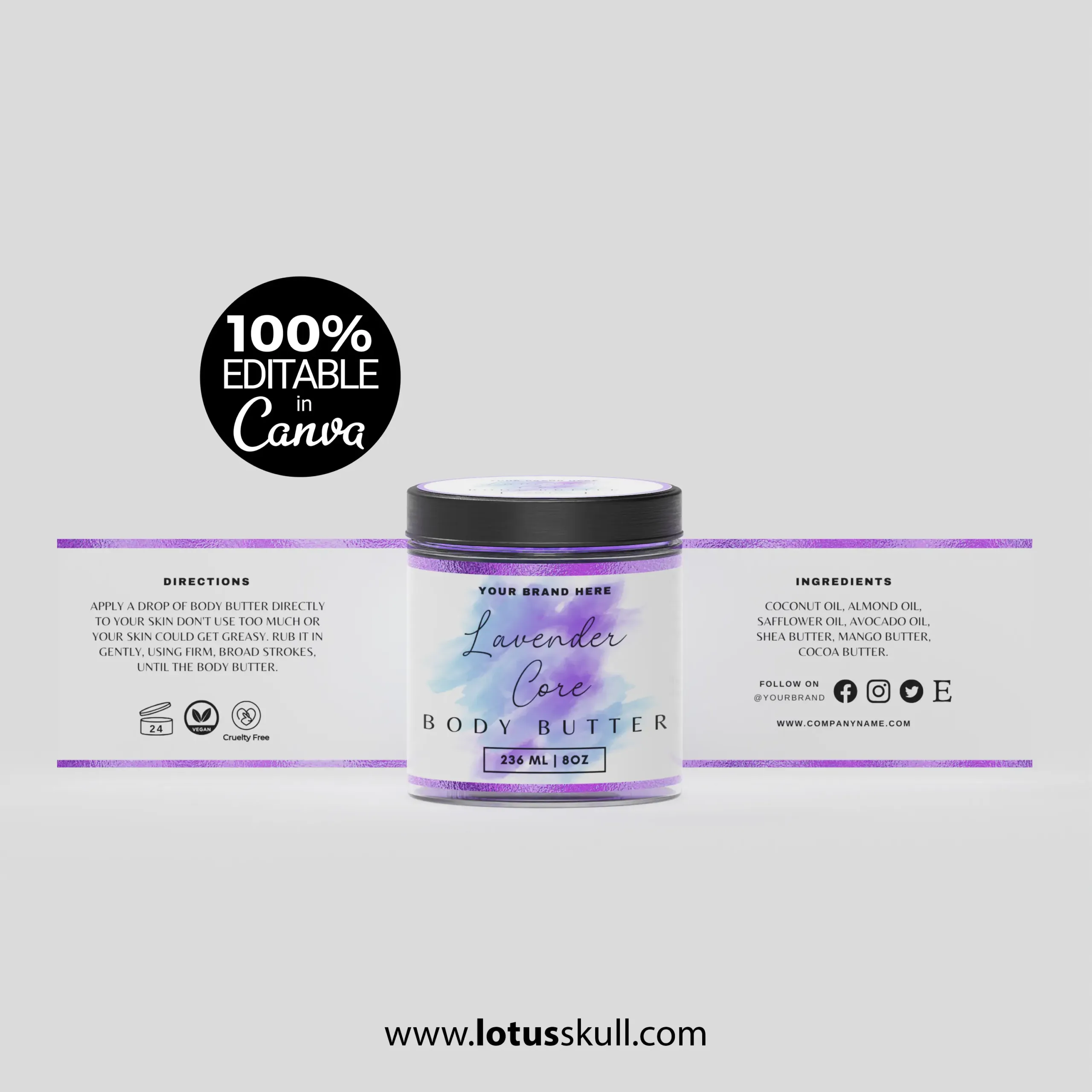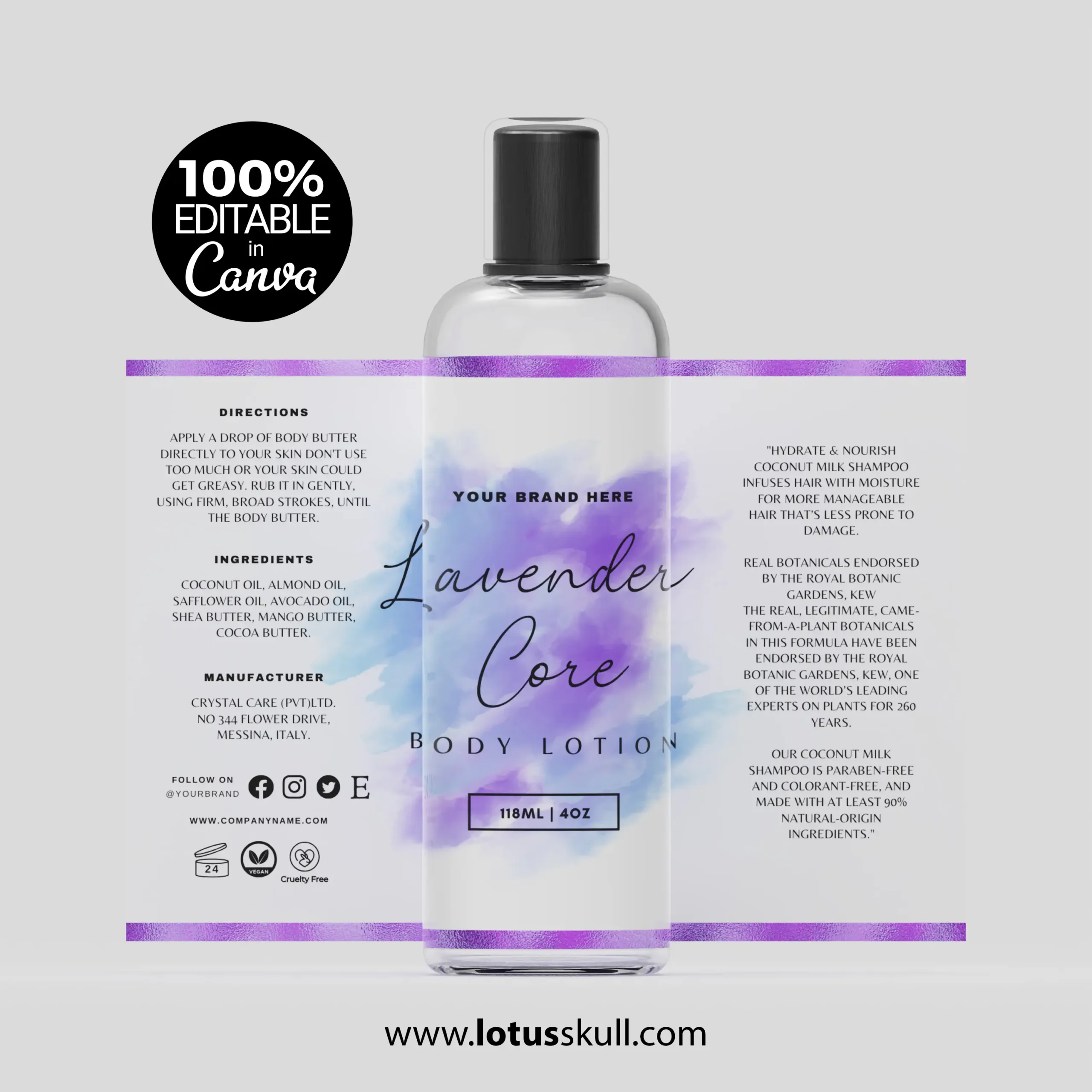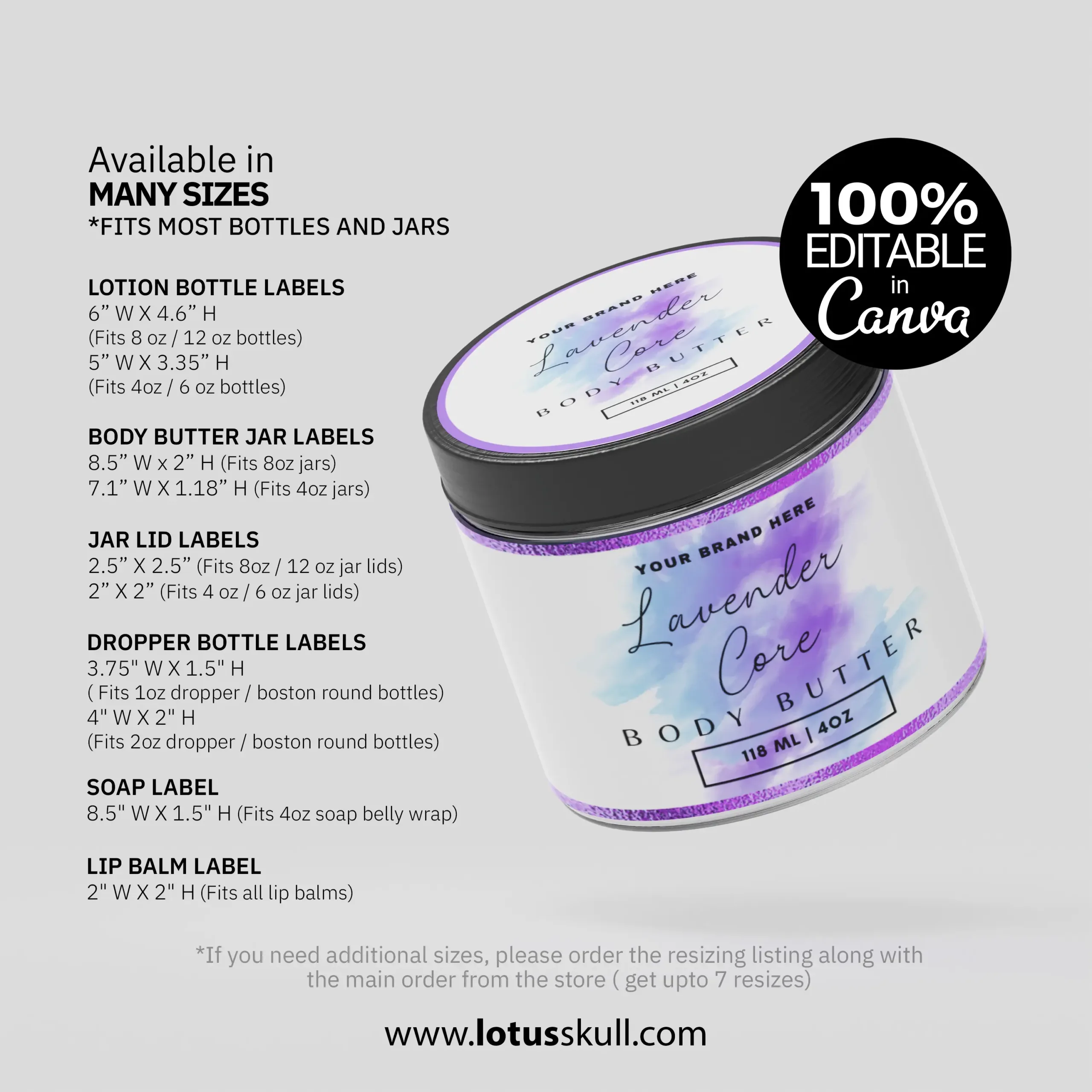 Elevate your product packaging with Lavender Care – Watercolor Themed Product Label Templates. Designed for beauty, skincare, and wellness products, these editable templates feature soft watercolor accents and calming lavender tones, perfect for creating a sophisticated and natural look. Fully customizable, you can easily adjust text, colors, and layout to match your brand identity. Ideal for small businesses, DIY creators, and boutique product lines, these labels help your products stand out with a gentle, elegant aesthetic. Includes Label Templates for Shampoo bottles, Lotion Bottles, Dropper Bottles 1oz, and 2oz, Soap Belly Wrap,8oz, and 4oz Body Butter Jar with Lid Labels.